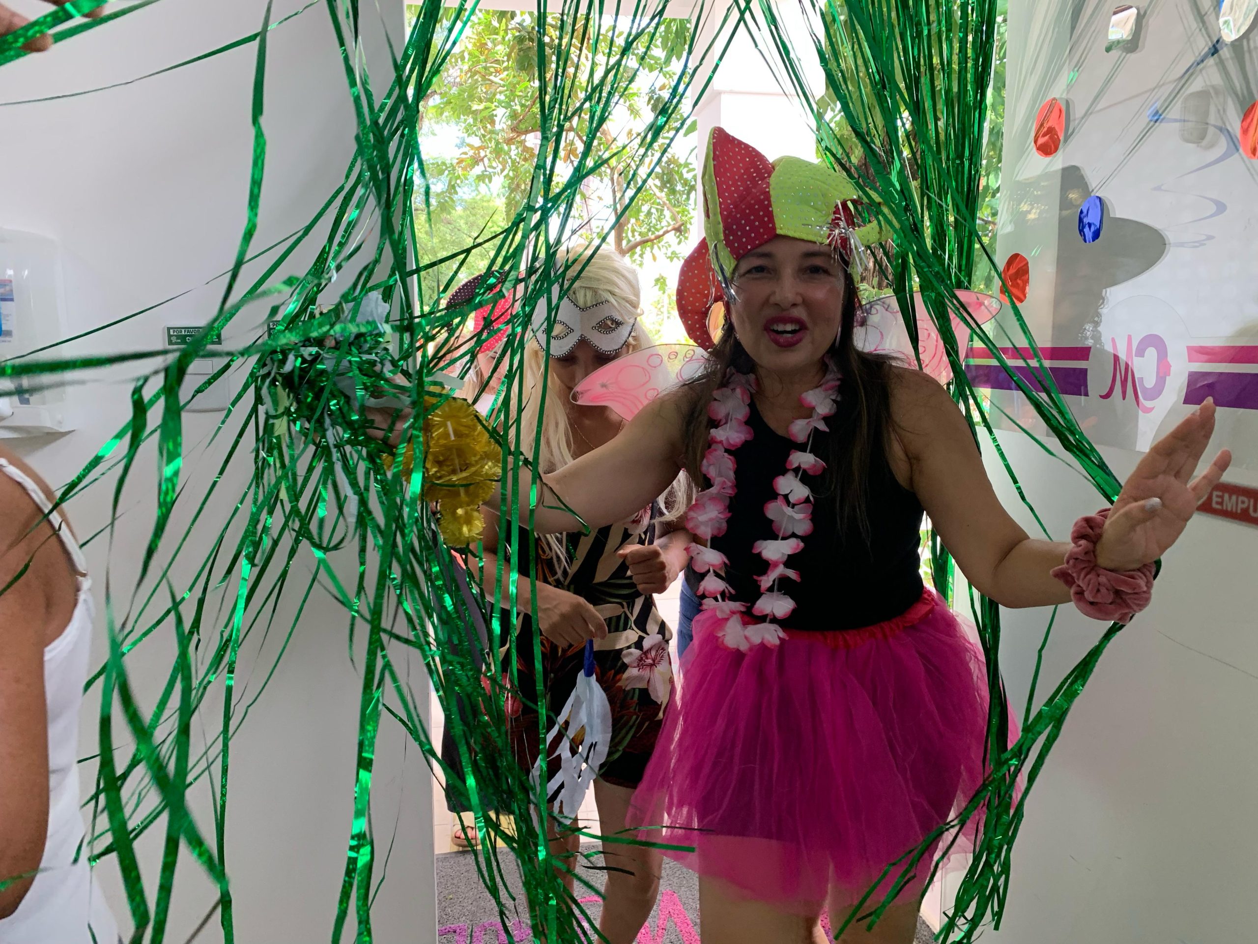 Antes de caírem na folia, as pacientes passaram por produção temática com maquiagens coloridas, adereços e fantasias. O momento de beleza aconteceu no espaço dedicado à autoestima e bem-estar das pacientes da Casa, com o projeto Beleza de Viver.