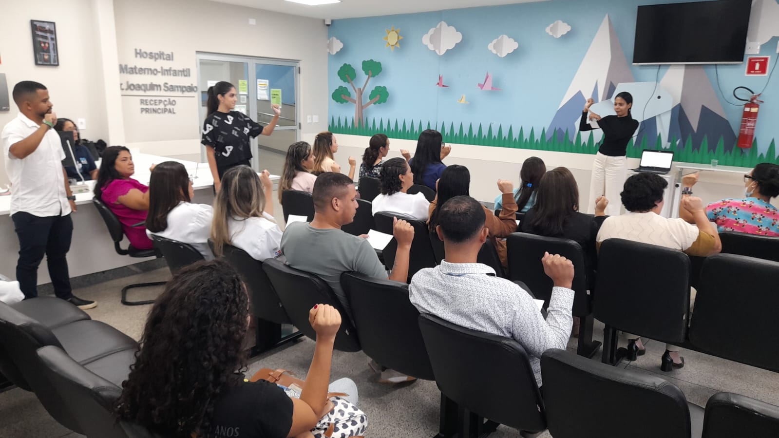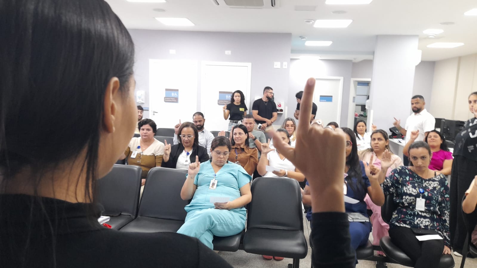 As duas primeiras turmas de trabalhadores do Hospital Materno-Infantil Dr. Joaquim Sampaio, em Ilhéus, unidade do Governo da Bahia administrada pela Fundação Estatal Saúde da Família (FESF-SUS), participam do módulo básico do curso de Língua Brasileira de Sinais (Libras) na instituição, nesta quarta e quinta-feira (28 e 29). A iniciativa tem como objetivo aprimorar o atendimento e melhorar o acolhimento e a comunicação entre os profissionais e pacientes com deficiência auditiva.