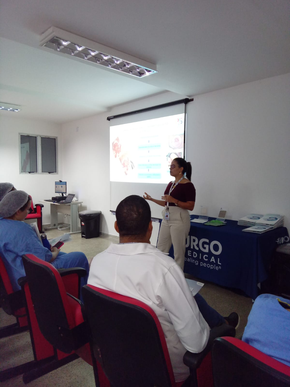 Durante a capacitação, profissionais da equipe multiprofissional assistencial participaram de uma apresentação detalhada sobre os tipos de curativos existentes e a forma adequada de utilizá-los, de acordo com as atualizações mais recentes no cuidado com feridas. A facilitadora destacou aspectos técnicos fundamentais para a limpeza eficaz do leito da ferida, promovendo um ambiente propício à cicatrização e à redução de riscos de infecção.