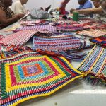 As tapeçarias foram produzidas no formato de bandeirolas no ensejo dos preparativos juninos, com o objetivo de serem utilizadas na decoração da festa de São João do Centro de Referência, o “Arrasta-pé Vila Creasi”. Ocorreram, no período, oficinas temáticas com diversos pacientes da Unidade (NAG e Fisioterapia) que criaram adereços para a folia junina, sempre com foco terapêutico e desenvolvendo peças que faziam sentido para cada indivíduo.