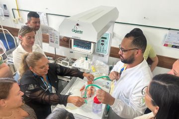 No período da tarde, foi a vez do treinamento prático, que contou com a contribuição direta da própria Fernanda Habib, ao lado da enfermeira intensivista Alda Nery e do fisioterapeuta Tiago Viana, ambos da UTI Neonatal do CHVC. Entre os conteúdos, ganharam destaque a higienização correta das mãos, a confecção artesanal de baixo custo do CPAP (Pressão Positiva Contínua nas Vias Aéreas) e o manuseio do balão autoinflável, conhecido como Ambu, utilizado em situações de suporte ventilatório.
