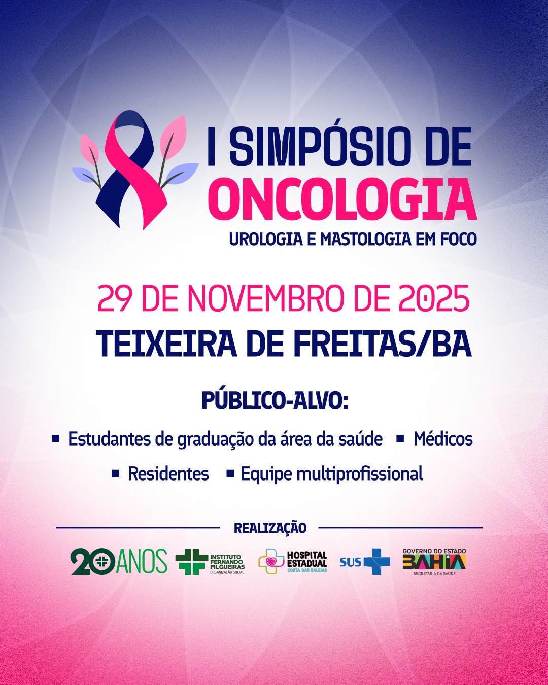 O Hospital Estadual Costa das Baleias (HECB) promoverá, no dia 29 de novembro de 2025, o I Simpósio de Oncologia, que acontecerá na Universidade Federal do Sul da Bahia (UFSB), Campus Paulo Freire – Complexo 2, em Teixeira de Freitas (BA).