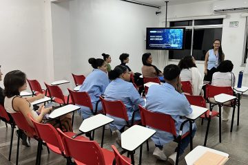 O grupo foi recebido pela coordenadora de Treinamento e Desenvolvimento, Zilnora Morais, que fez a abertura da atividade e foi seguida pela apresentação institucional conduzida pela enfermeira Ana Carolina Couto, que contextualizou a atuação do CEDAP na rede de atenção à saúde, detalhando os atendimentos realizados, as especialidades disponíveis e a organização dos serviços. Durante sua fala, destacou especialmente o papel da enfermagem na unidade, evidenciando as ações de cuidado, acolhimento e acompanhamento desenvolvidas junto aos usuários.