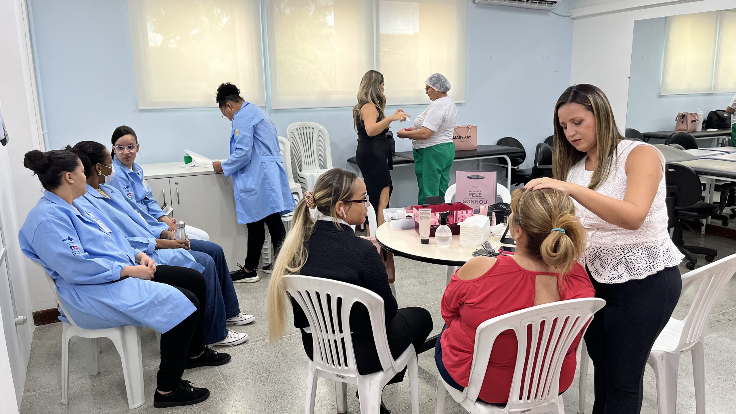 No dia 26 de março, a Sala de Oficinas se transformou em um espaço dedicado ao cuidado com a autoestima, com atividades que incluíram orientações sobre cuidados com a pele e dicas práticas de maquiagem, incentivando momentos de leveza e autocuidado.