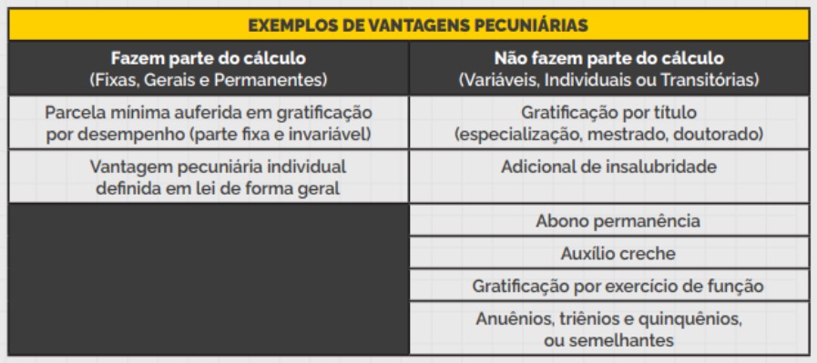 As gratificações variáveis, individuais ou transitórias. Exemplos de gratificações que não fazem parte do cálculo do piso: Parcelas indenizatórias (auxílio-transporte, auxílio-alimentação, etc.); Adicional noturno; Adicional de insalubridade, de periculosidade ou pelo exercício de atividades penosas percebidas durante o período em que o beneficiário estiver sujeito às condições ou aos riscos que der causa à sua concessão; Adicional pela prestação de serviço extraordinário; Estabilidade Econômica; Anuênios, triênios, quinquênios e parcelas similares.