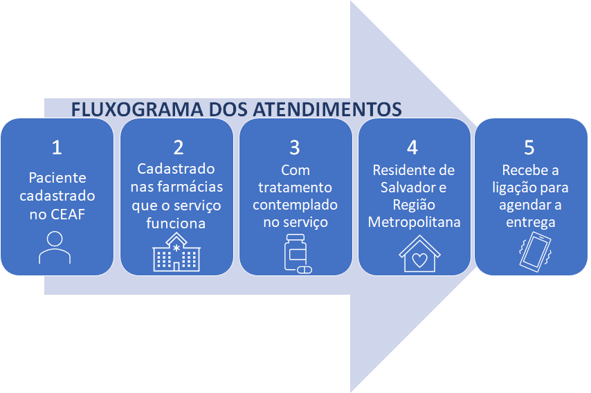 Diante do atual cenário de enfrentamento à pandemia da Covid-19 a Secretaria de Saúde do Estado da Bahia implantou o serviço de entrega domiciliar de medicamentos do Componente Especializado da Assistência Farmacêutica-CEAF. A iniciativa visa reduzir a formação de filas, diminuir aglomerações e reduzir exposição de pacientes que fazem parte do grupo de risco do Coronavírus. A estratégia começou a funcionar no dia 28/05, e os pacientes compreendidos no público alvo do projeto estão sendo contactados pelas farmácias eleitas para o funcionamento do projeto, para informam sobre o serviço e agendam a entrega do medicamento.