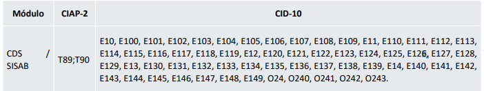 A indicação “Sim” no campo “Tem diabetes?” na FCI realizada por todos os profissionais de saúde, ou a indicação de Diabetes para a condição avaliada no campo rápido de “Problema ou Condição Avaliada” ou a inserção dos seguintes códigos CID-10 ou CIAP-2: