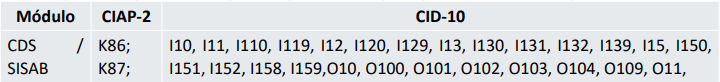 A indicação “Sim” no campo “Tem hipertensão arterial?” na FCI realizada por todos os profissionais de saúde, ou a indicação de Hipertensão para a condição avaliada no campo rápido de “Problema ou Condição Avaliada” ou a inserção dos seguintes códigos CID-10 ou CIAP-2 em atendimentos por profissionais médicos e enfermeiros:
