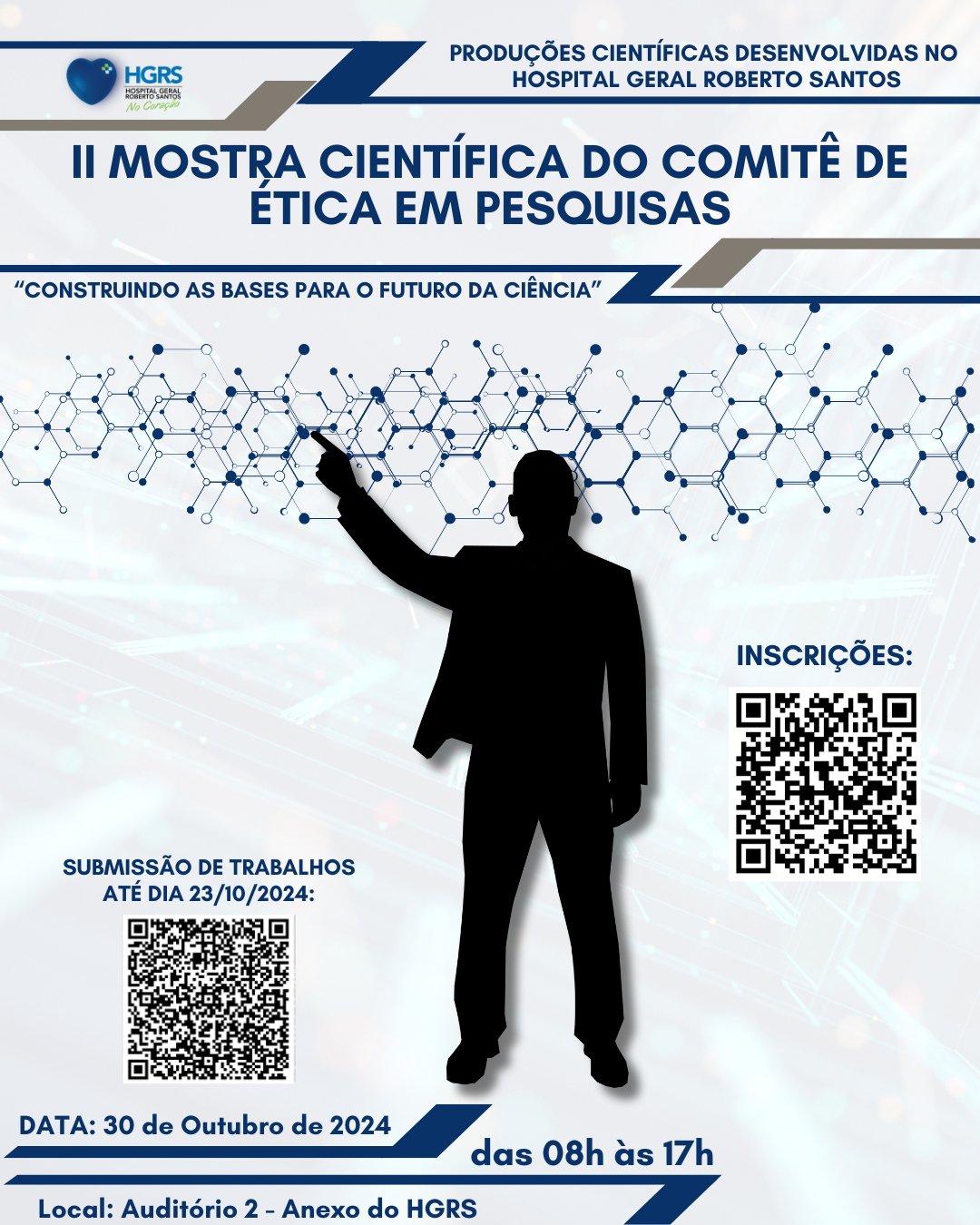 O Hospital Geral Roberto Santos (HGRS), configura-se como maior hospital público do estado da Bahia na atenção em média e alta complexidade, certificado pelo Ministério da Saúde e de Educação como Centro de formação profissional em áreas de graduação, residência médica, multiprofissional e campo de ensino e pesquisa, possuindo o seu próprio CEP (Comitê de Ética em Pesquisa), anuncia a abertura das inscrições para a II Mostra Integrada em Pesquisa. O evento será realizada pelo CEP do HGRS no dia 30 de outubro, de modo presencial, das 08:00 às 17:00hs, no Auditório 2 do Anexo – Hospital Geral Roberto Santos, situado na cidade de Salvador-BA. A II Mostra tem como tema: “Construindo as bases para o futuro da Ciência” e visa apoiar, disseminar e incentivar o ensino e a produção do conhecimento científico no Hospital Geral Roberto Santos (HGRS).