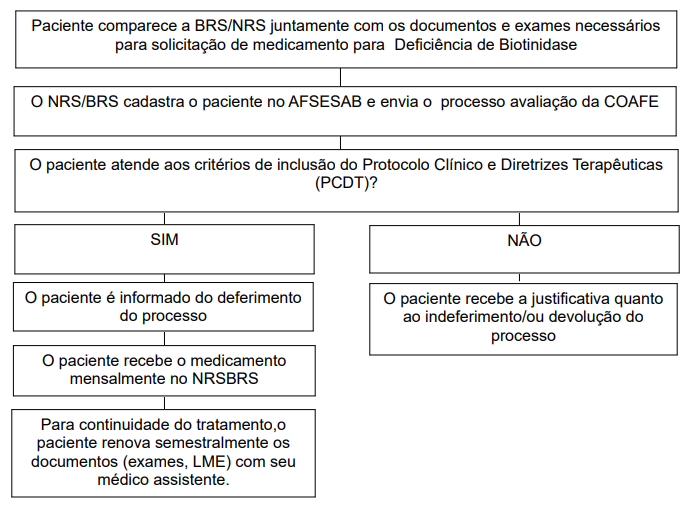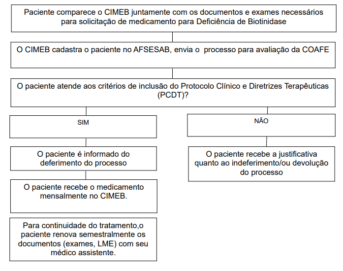 Observação: A 1ª renovação de casos suspeitos, na qual deve ser anexado cópia de exame laboratorial de determinação quantitativa plasmática da atividade enzimática da biotinidase por método colorimétrico ou fluorimétrico, deverá ser encaminhada à COAFE para avaliação.