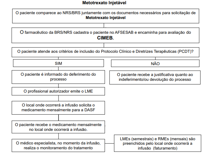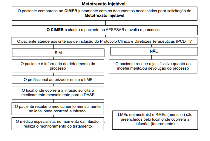Metotrexato (MTX): AST/TGO e ALT/TGP, hemograma com contagem de plaquetas e dosagem de ureia e creatinina. Periodicidade: mensalmente nos primeiros 3 meses e, após, a cada 3 meses durante seu uso ou conforme a necessidade clínica.