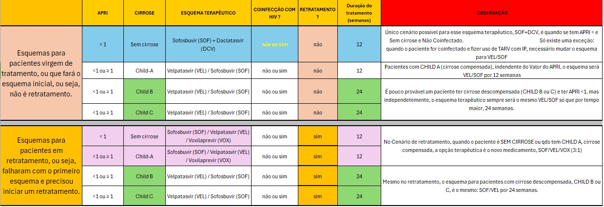Nos casos de pessoas com coinfecção HIV/HCV, é importante destacar que nenhum dos esquemas terapêuticos disponíveis pode ser usado em conjunto com inibidores de transcriptase reversa não-análogos de nucleotídeo (ITRNN), como Efavirenz, Nevirapina e Etravirina. Caso a pessoa coinfectada esteja fazendo uso de TARV contendo algum ITRNN, essa prescrição deve ser revista para possibilitar o tratamento da hepatite C;