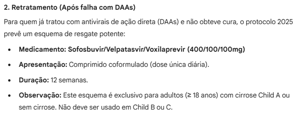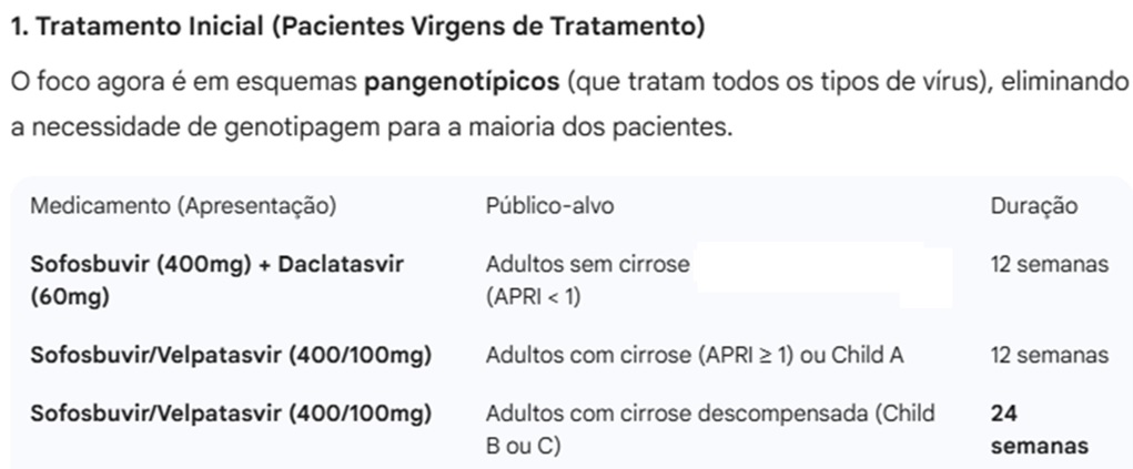 Tratamento: O objetivo do tratamento é a obtenção da resposta virológica sustentada (RVS), que se caracteriza pela ausência de HCV-RNA na 12ª ou 24ª semana após o término da terapia medicamentosa;