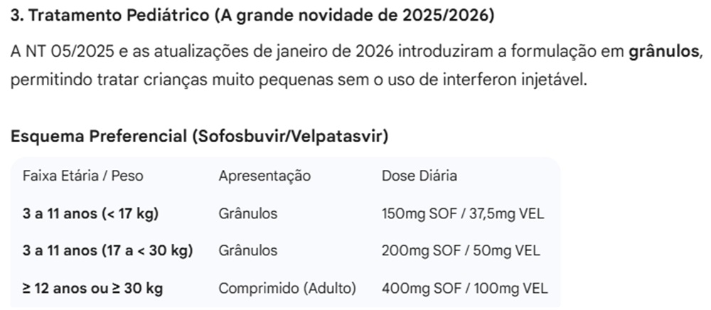 Para crianças menores de 12 anos, a decisão de iniciar a terapia deverá ser individualizada. Os casos devem ser referenciados para centros com experiência no tratamento de hepatite C.